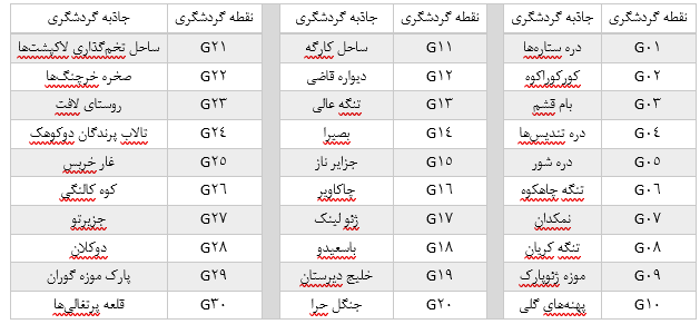 جاذبههای گردشگری ژئوپارک قشم در جدول زیر آورده شده است.